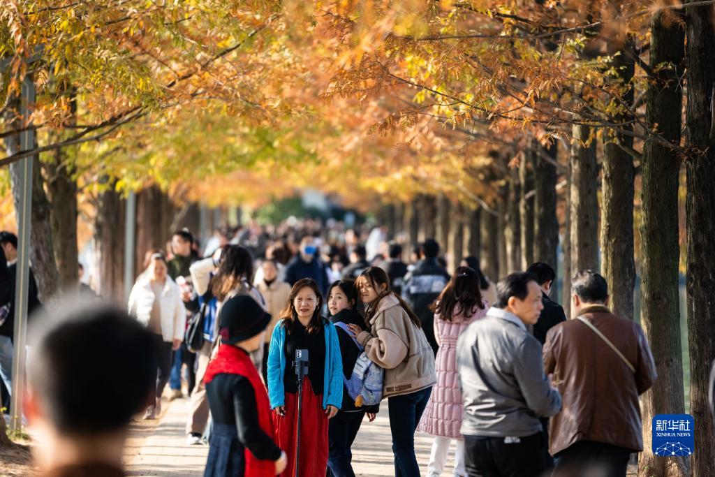 近日,湖南省长沙市烈士公园的水杉树叶渐露金黄,景色如画,吸引市民前来游玩打卡。