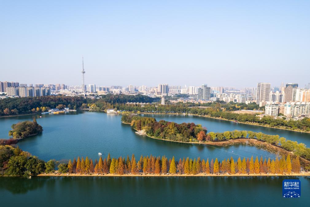 近日,湖南省长沙市烈士公园的水杉树叶渐露金黄,景色如画,吸引市民前来游玩打卡。