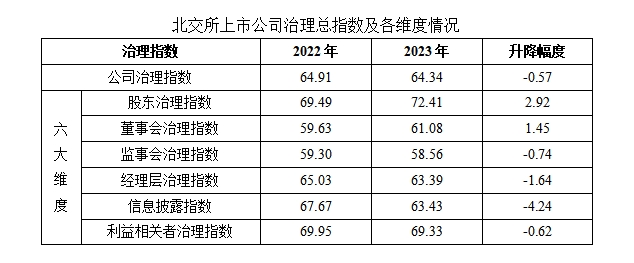 2023年,北交所上市公司治理指数平均值为64.34,较2022年下降0.57,中位数为64.32,最小值为53.30,最大值为72.30,标准差为3.58。报告从治理评级、控股股东性质、地区、行业、维度等多角度综合评估了北交所上市公司的治理情况。
