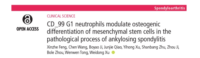近日,长海医院关节骨病外科徐卫东教授团队在英国医学杂志(British Medical Journal, BMJ)子刊、国际风湿病学领域顶刊《Annals of the Rheumatic Diseases》(风湿病年鉴)(IF= 27.4,中科院1区)以“原创论著”形式在线发表《CD_99 G1中性粒细胞在强直性脊柱炎发病过程中调控间充质干细胞成骨分化》。