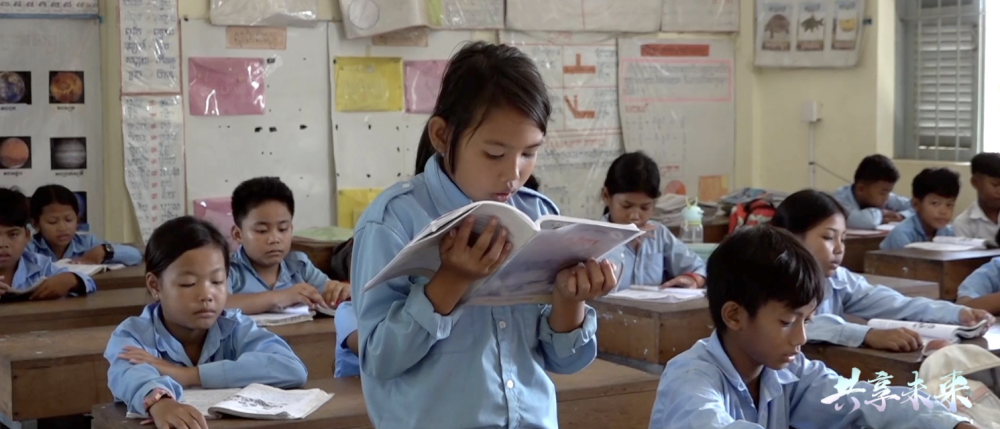 在柬埔寨,小学生桑斯蕾尼扬搬进了新的校舍。为期3年的中柬友好扶贫示范村项目2021年正式启动,中方出资帮助达弄村建设乡村道路,提供清洁饮用水,改善教育和医疗条件,发展养殖、畜牧业,开展技能培训,改善村庄公共环境。