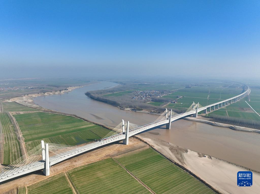 12月8日,列车驶过济郑高铁长清黄河铁路特大桥(无人机照片)。新华社记者 邢广利 摄