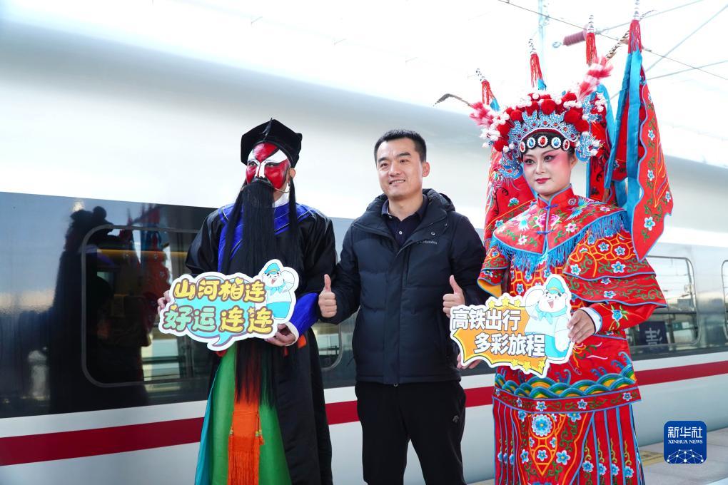 12月8日,在济郑高铁济南长清站,一名乘客与参加济郑高铁全线开通仪式的戏剧演员一起合影。新华社记者 徐速绘 摄