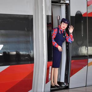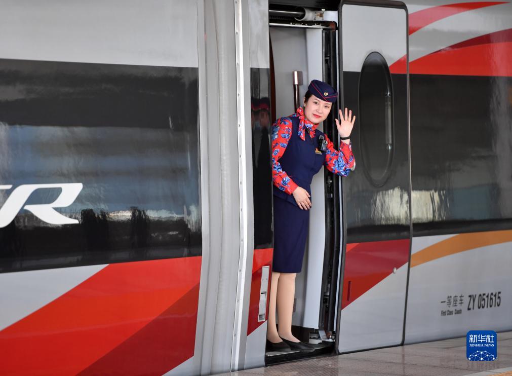 12月8日,济郑高铁郑州东站首发G4830次列车乘务员向旅客挥手致意。新华社记者 李嘉南 摄