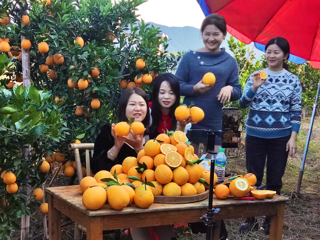 “身后是我自己家的脐橙园,保证您的橙子都是新鲜采摘、当天发货。”信丰县果农殷春梅对着手机正向观众直播。