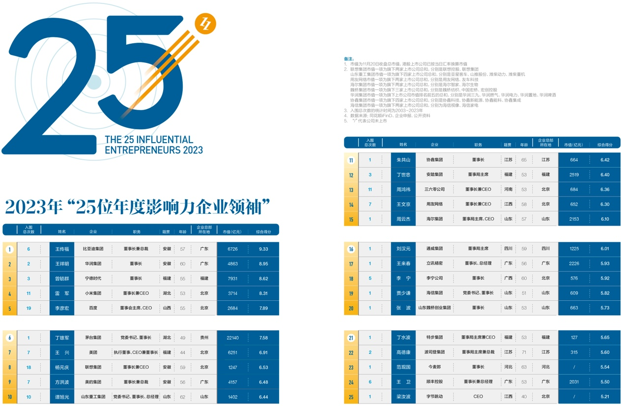 图表:《中国企业家》杂志2023年“25位年度影响力企业领袖”名单