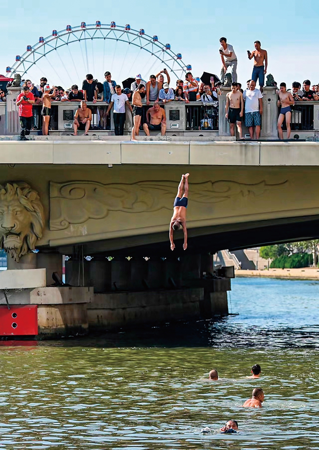 8月29日,在天津海河上,一位“大爷”从狮子林桥跳入水中。新华每日电讯记者 孙凡越 摄