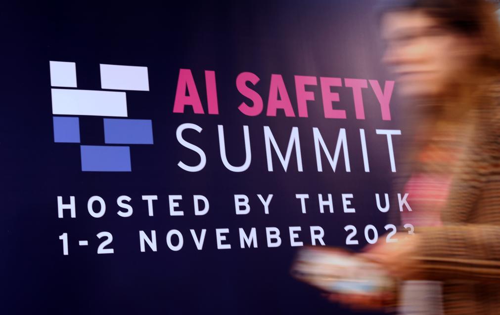 2023年11月2日,在英国布莱奇利园,一名参会者经过首届人工智能安全峰会的宣传展板。新华社记者李颖摄