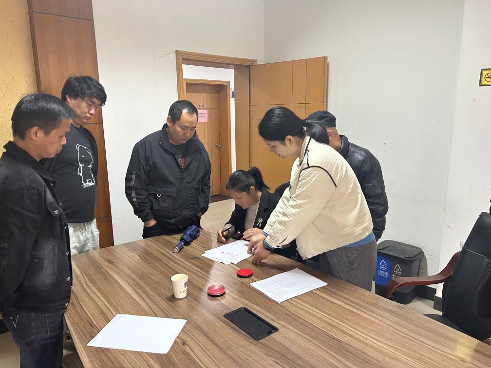 义乌市一欠薪公司代表与员工、保险公司代表签订“保险先给付员工工资,再向欠薪公司追偿”的理赔三方协议。(义乌市人社局供图)