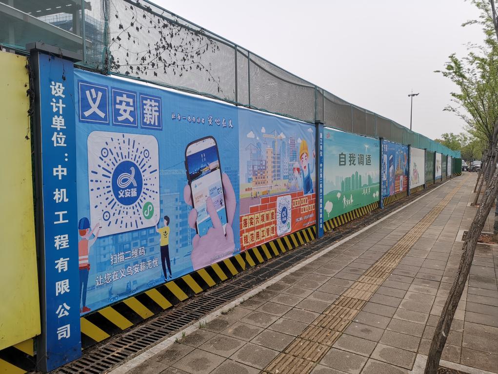 义乌市一在建工地围挡上粘贴的“义安薪”劳资纠纷维权码。(义乌市人社局供图)