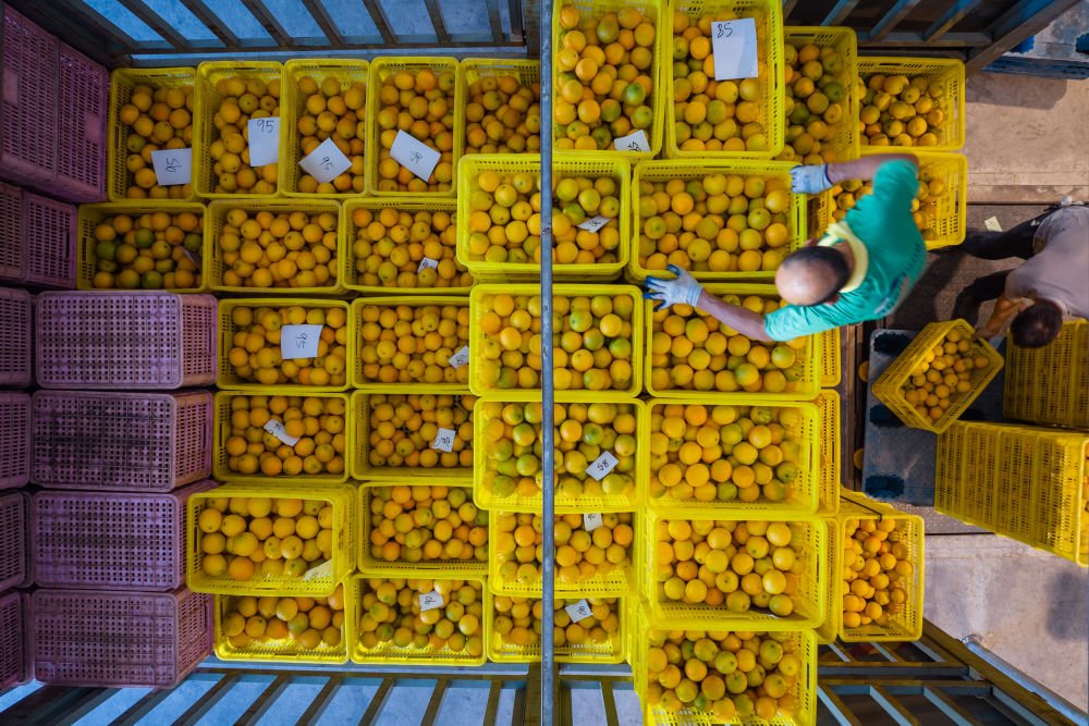 在秭归县脐橙文旅小镇数字化电商中心,工作人员将夏橙装车(2023年8月4日摄)。新华每日电讯记者 伍志尊 摄