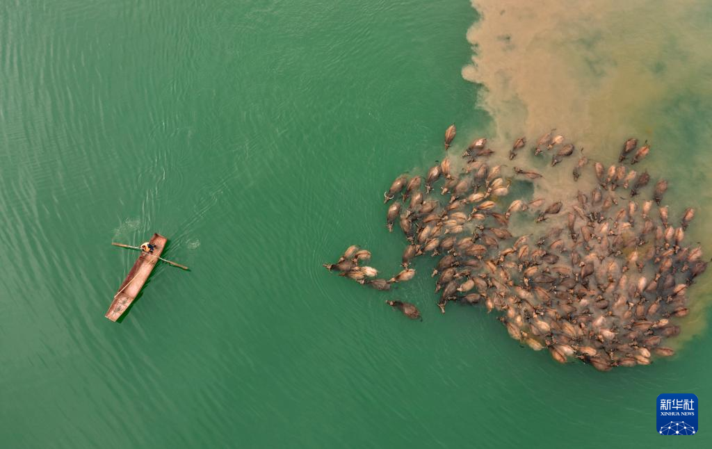 2023年5月13日,在四川省南充市蓬安县相如镇油房沟村嘉陵江段,成群结队的水牛渡江(无人机照片)。