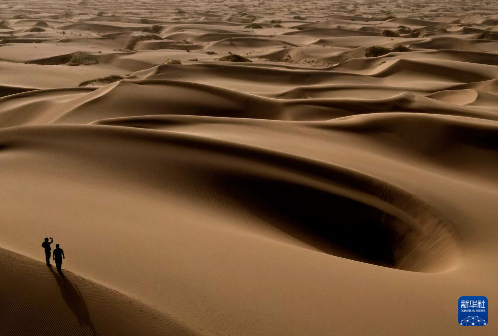 2023年9月7日在新疆喀什地区麦盖提县N39°沙漠旅游景区拍摄的沙漠风光(无人机照片)。