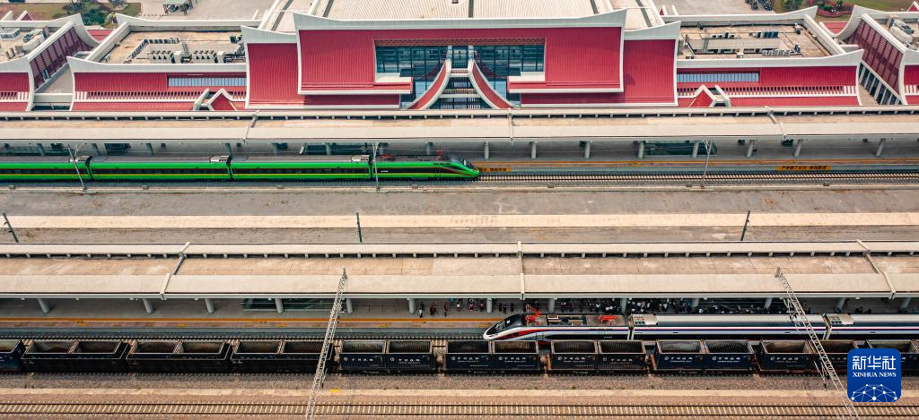 2023年4月13日,“复兴号”(上)和“澜沧号”动车组列车停靠在云南省西双版纳傣族自治州勐腊县中老铁路磨憨站(无人机照片)。当日,中老铁路开行国际旅客列车,昆明至万象间可实现乘火车当日通达。