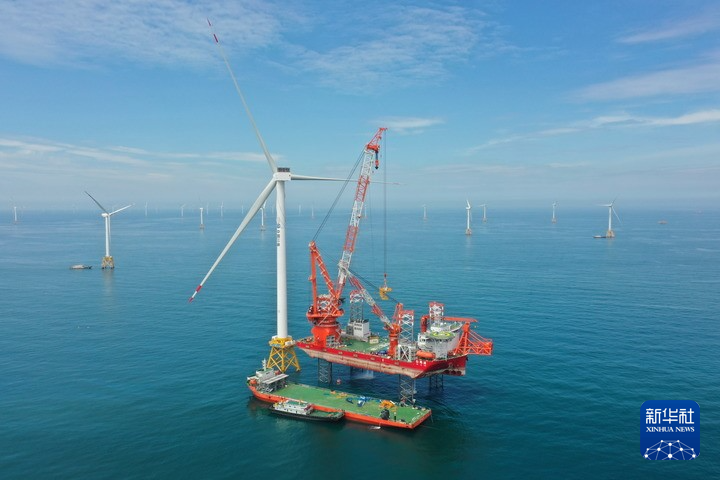 2023年6月28日,全球首台16兆瓦海上风电机组在福建北部海域顺利完成吊装(无人机照片)。这标志着我国海上风电高端装备制造能力、深远海海上风电施工等全产业链实现整体提升,达到国际领先水平。