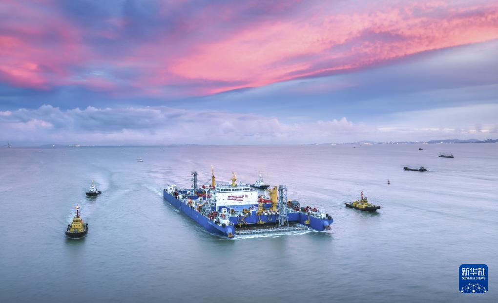 2023年6月8日,“一航津安1”号沉管运输安装一体船将E23管节和最终接头浮运至安装现场(无人机照片)。6月11日凌晨,世界最长最宽的钢壳沉管隧道——深中通道海底隧道管节最终接头合龙,32个8万吨级的管节和最终接头犹如海底巨龙横卧珠江口,为这条全长24公里、集“隧、岛、桥、水下互通”于一体的超级跨海集群工程打通关键环节。