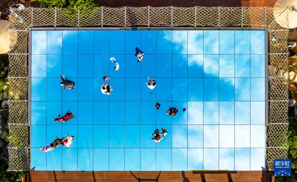 2023年4月29日,游客在贵州省黔西市化屋露营基地“天空之镜”景点休闲游玩(无人机照片)。