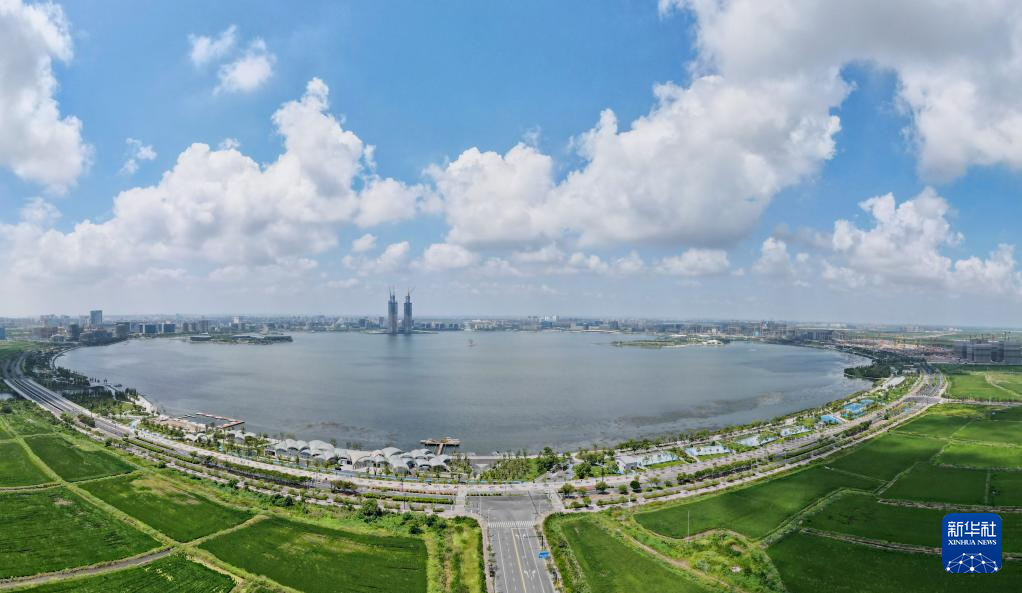 2023年9月6日拍摄的中国(上海)自由贸易试验区临港新片区滴水湖(无人机全景照片)。