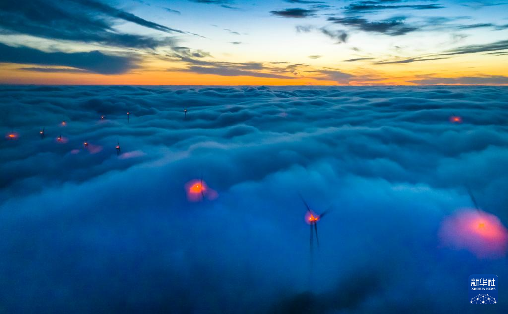 2023年2月23日晚在湖北省宜昌市秭归县两河口镇云台荒村拍摄的风力发电机组(无人机照片)。