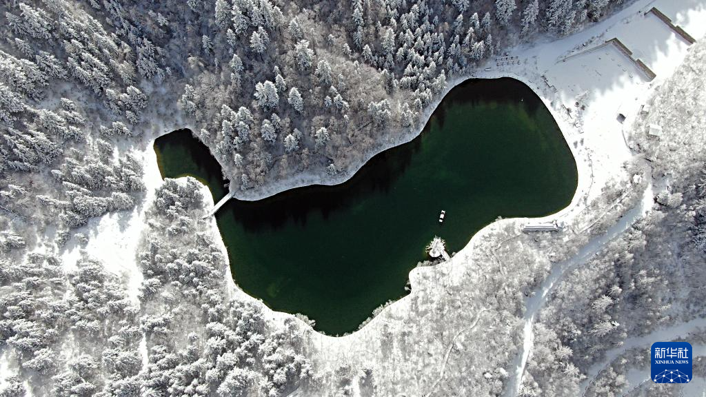 2023年4月6日在甘肃省陇南市宕昌县的官鹅沟森林公园鹅嫚沟景区拍摄的雪景(无人机照片)。