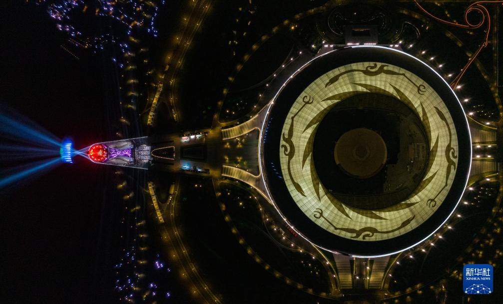 2023年4月19日在四川成都拍摄的第31届世界大学生夏季运动会开幕式主体育场及主火炬(无人机照片)。