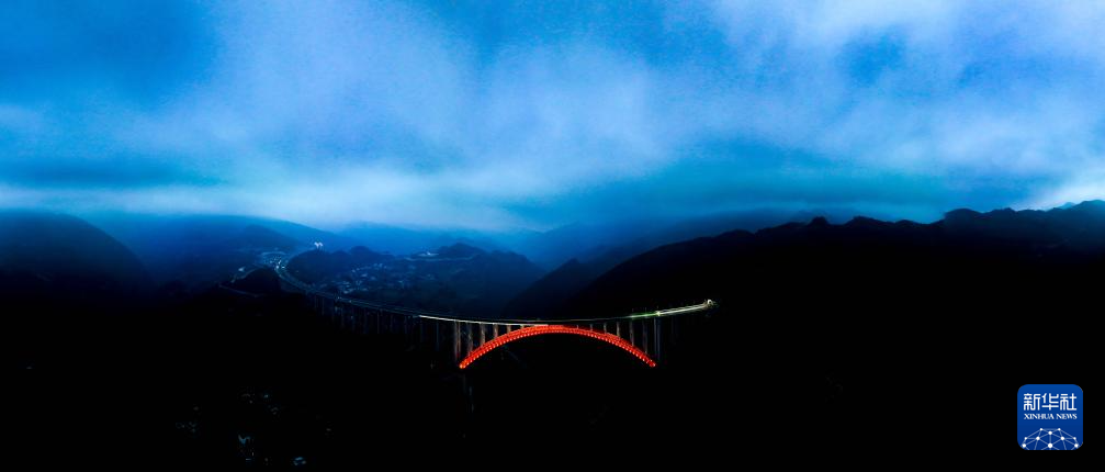 2023年2月2日在贵州省遵义市拍摄的夜幕下的大发渠特大桥(无人机全景照片)。大发渠特大桥全长1427米、主跨410米、桥宽33米,是仁遵高速公路的控制性工程之一。