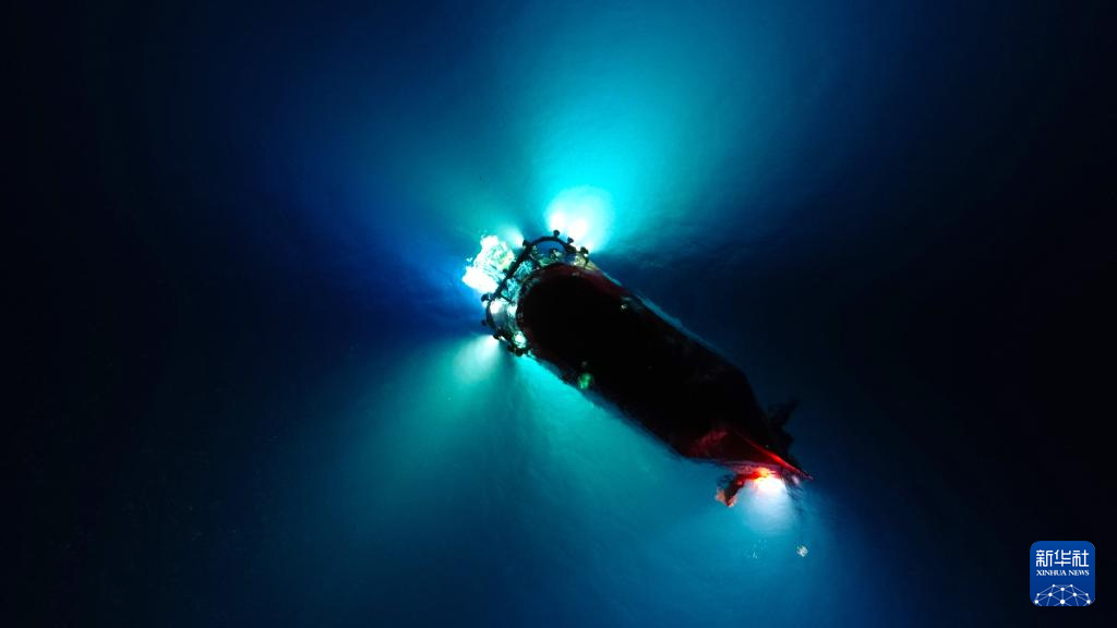 2023年5月30日,俯瞰驶向深海考古的潜水器——“深海勇士”号(无人机照片)。中国文物工作者搭乘“深海勇士”号载人潜水器将水下永久测绘基点布放在海底,标志着南海西北陆坡一号、二号沉船第一阶段考古调查工作正式启动,我国深海考古的新篇章由此开启。