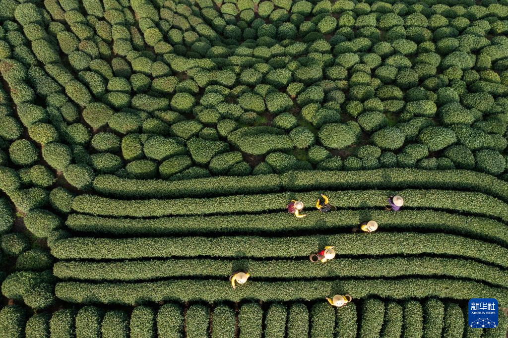 2023年3月13日,浙江杭州龙井村的茶农在采摘西湖龙井“明前茶”(无人机照片)。