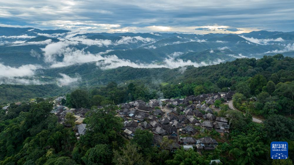 2023年9月17日在云南省普洱市拍摄的被山林与茶园环绕的景迈山翁基古寨一景(无人机照片)。9月17日,中国“普洱景迈山古茶林文化景观”申遗项目在第45届世界遗产大会上通过审议,列入《世界遗产名录》,成为中国第57项世界遗产。