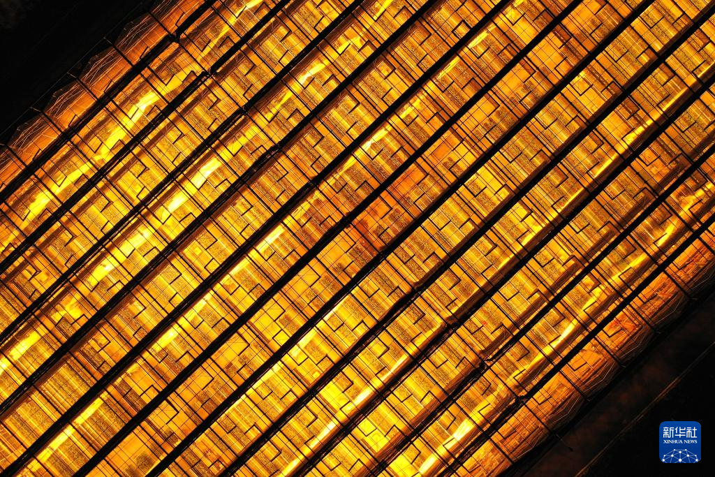 2023年5月25日拍摄的贵阳市开阳县南江蔬菜良种繁育中心育苗大棚夜间补光场景(无人机照片)。补光更有利于种苗生长,缩短育苗周期。