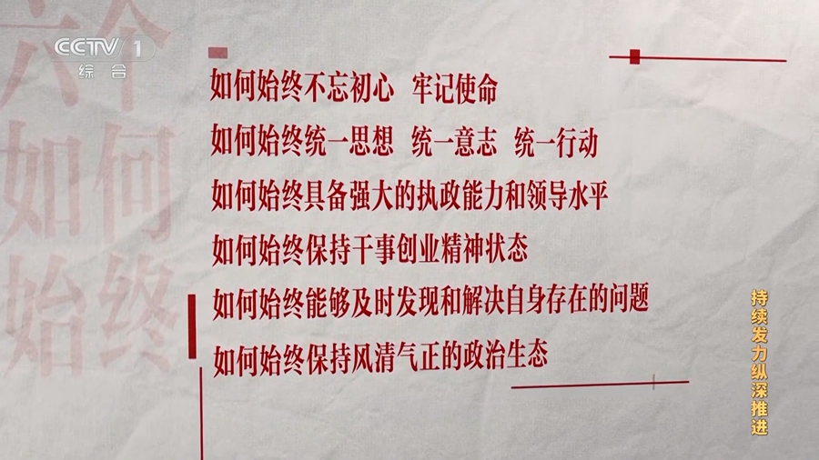 【解说词】“六个如何始终”充分揭示出,党内存在的政治不纯、思想不纯、组织不纯、作风不纯等突出问题尚未得到根本解决,一些已经解决的问题有可能死灰复燃,一些新的问题还在不断出现。解决好这些难题,是实现新时代新征程党的使命任务必须迈过的一道坎,是全面从严治党适应新形势新要求必须啃下的硬骨头。