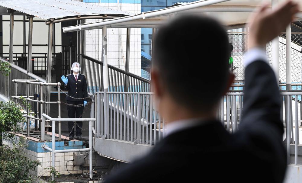 在广东徐闻的粤海铁路轮渡北港码头的人行栈桥上,肖玉凤(左)跟船上的丈夫李雄挥手告别(2023年1月9日摄)。