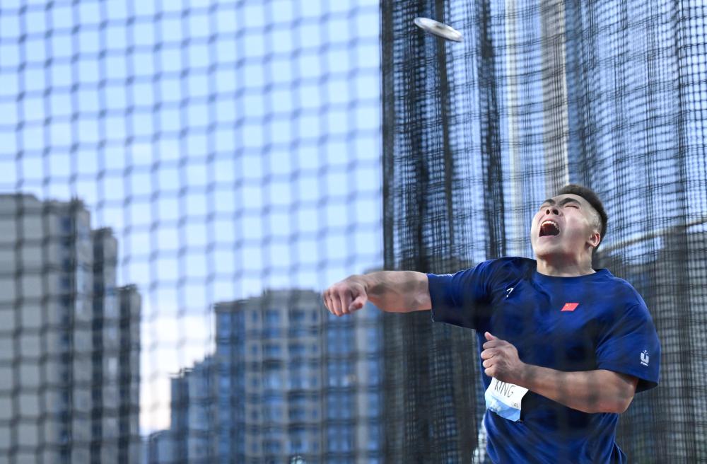 2023年8月2日,邢家栋在男子铁饼决赛中。