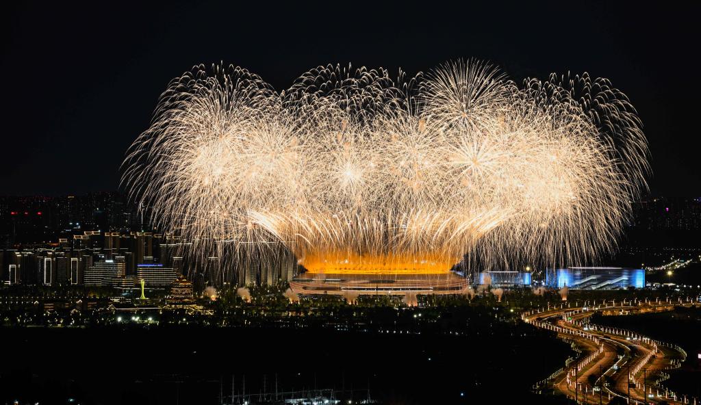 2023年7月28日拍摄的成都第31届世界大学生夏季运动会开幕式焰火。