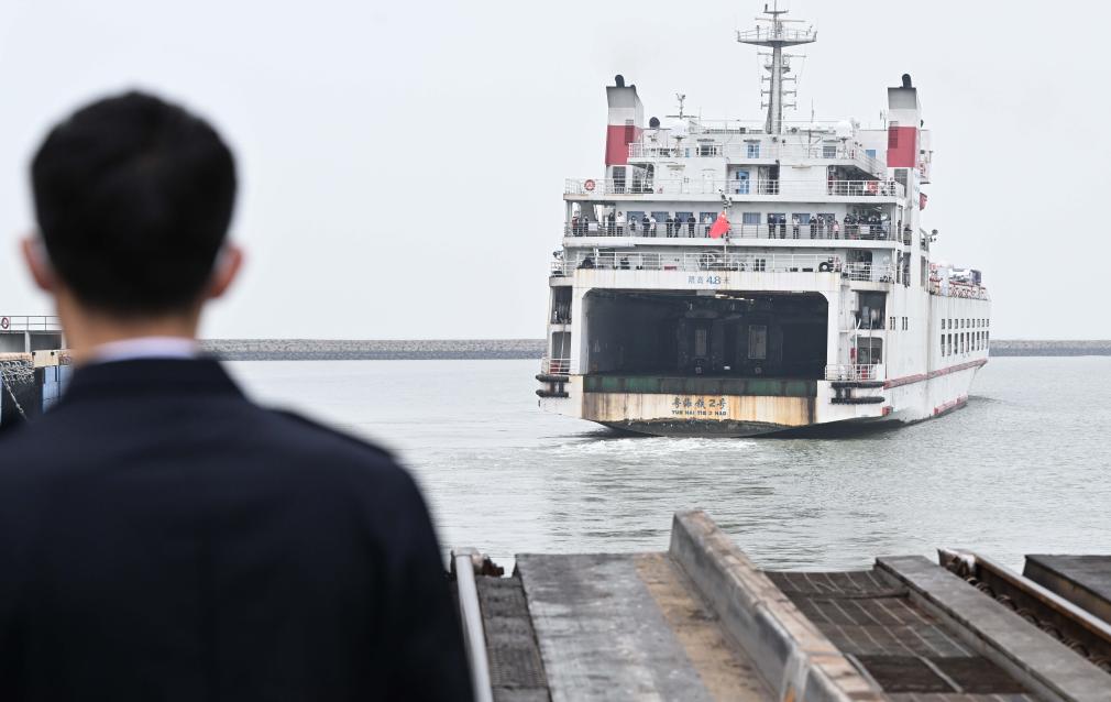在广东徐闻的粤海铁路轮渡北港码头的火车栈桥上,熊美周目送离港的轮渡(2023年1月8日摄)。