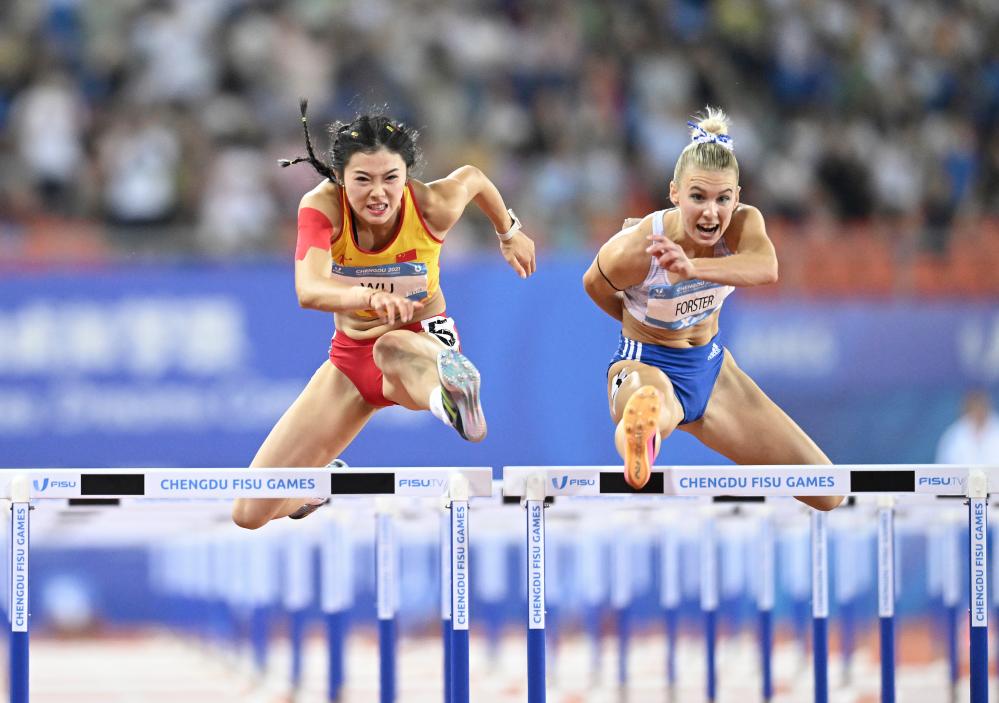 2023年8月4日,中国选手吴艳妮(左)在比赛中。 当日,在成都举行的第31届世界大学生夏季运动会田径项目女子100米栏决赛中,中国选手吴艳妮以12秒76的成绩夺得亚军。