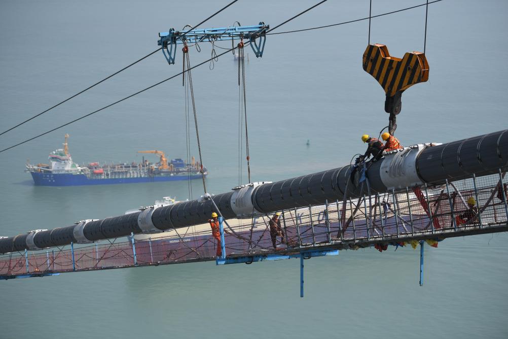 2023年2月22日,工人在深中通道伶仃洋大桥海上施工猫道及主缆上开展作业。