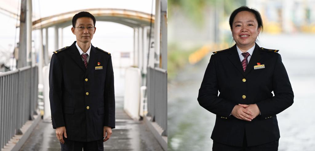 拼版照片:左图为李雄在粤海铁路轮渡上留影(2023年1月9日摄);右图为肖玉凤在广东徐闻的粤海铁路轮渡北港码头客运楼留影(2023年1月9日摄)。