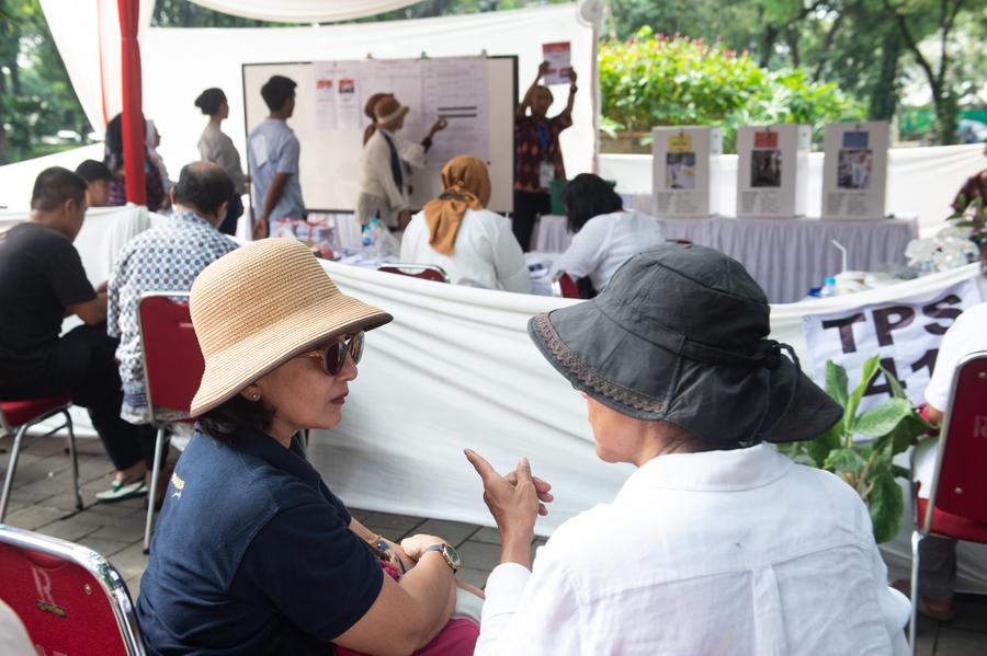2019年4月17日,在印尼雅加达一处投票站外,选民正在关注快速计票环节。新华社记者杜宇摄