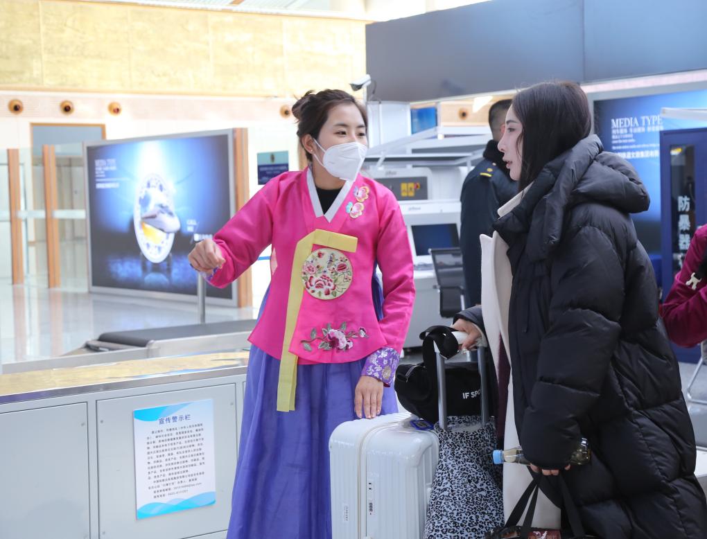 80多公里外的长春龙嘉国际机场,杭州游客李睿哲一手拿着滑雪板,一手拉着行李箱走出到达大厅,他将在龙嘉站换乘高铁前往到东北后的首个旅游目的地——延吉。