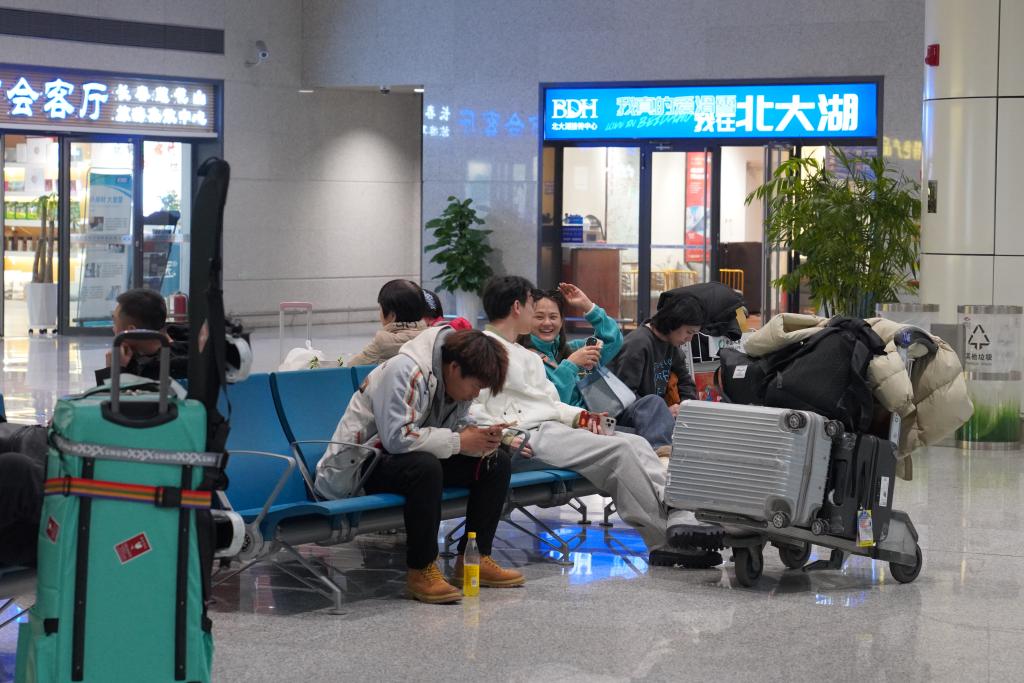 游客在长春龙嘉国际机场休息,准备换乘高铁列车。新华社记者司晓帅 摄
