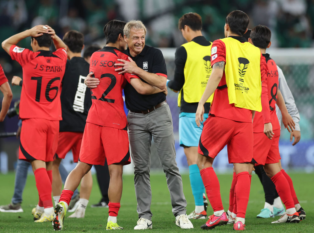 1月30日,韩国队主教练克林斯曼(中)在点球大战后与球员庆祝胜利。新华社记者 贾浩成 摄