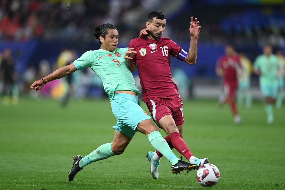 1月22日,中国队球员张玉宁(左)在比赛中与卡塔尔队球员拼抢。新华社记者 江汉 摄
