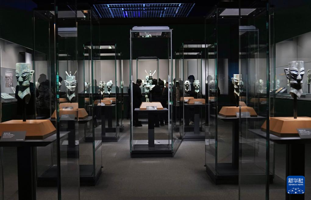 在“星耀中国——三星堆·金沙古蜀文明展”展厅里,四川广汉三星堆遗址出土的珍贵文物——金面具和竖披发青铜人像引人入胜。在约2000平方米的展厅空间里,上博以“天行乾道”“地势坤物”“人和明德”三个主题为线索,向海内外观众全面展示古蜀文明的独特魅力,沉浸式诠释中华文明发展的多元一体和开放包容特性。