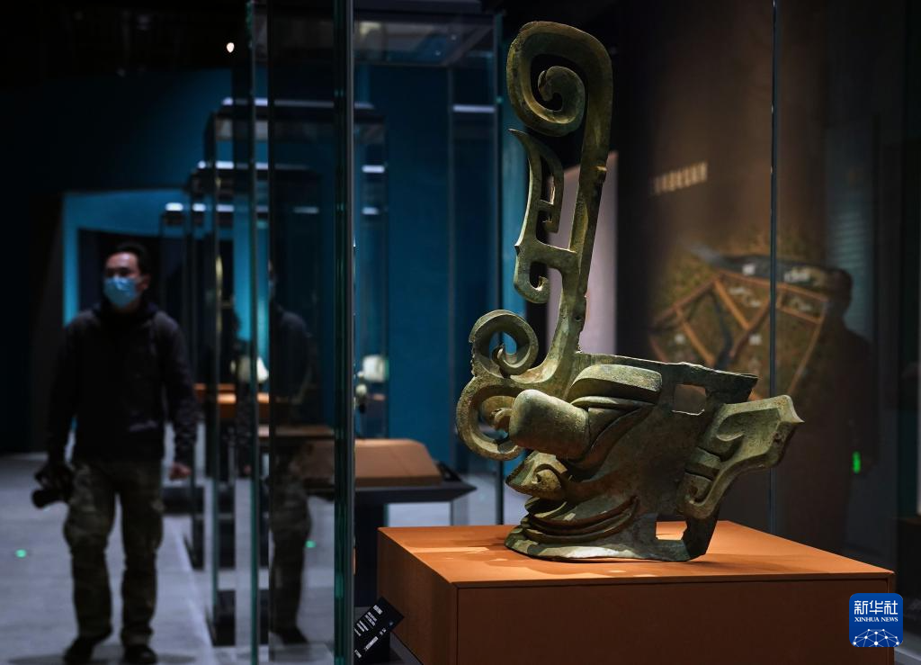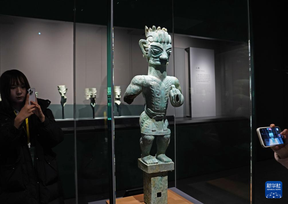 2月2日,观众在参观拍摄竖披发青铜人像。新华社记者 刘颖 摄