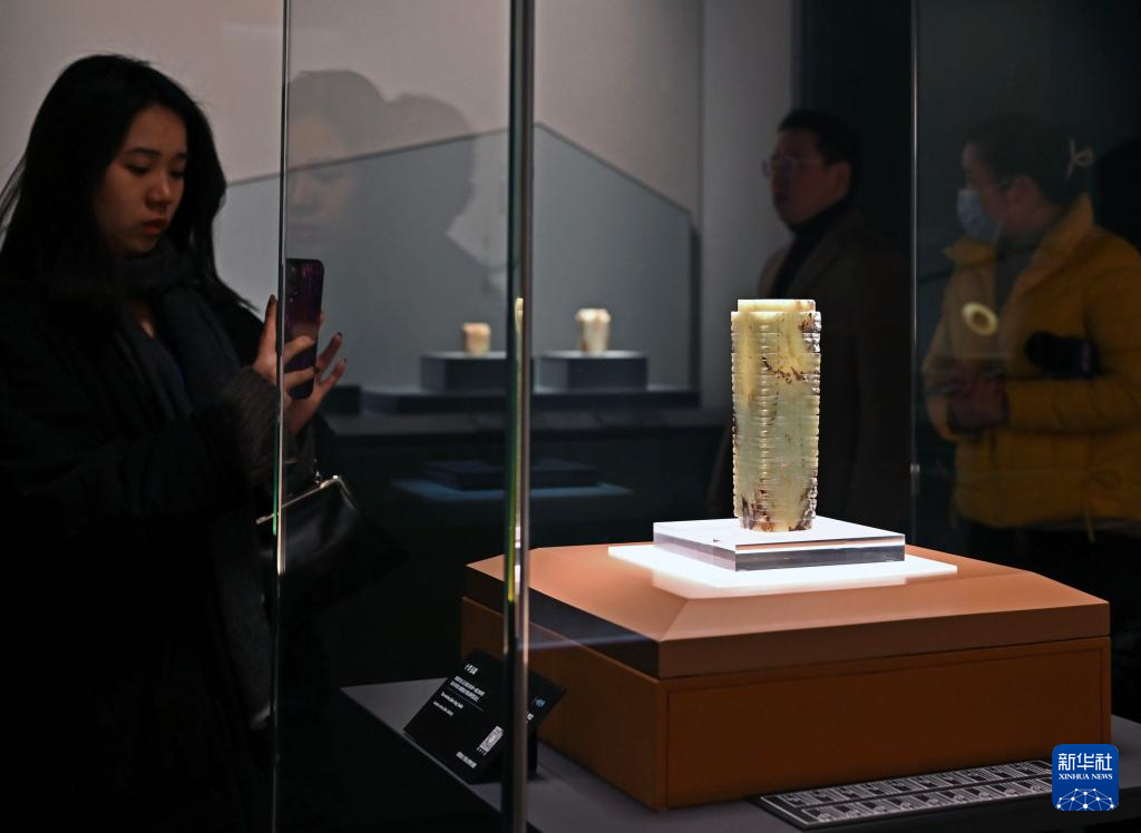2月2日,观众在参观拍摄十节玉琮。新华社记者 刘颖 摄