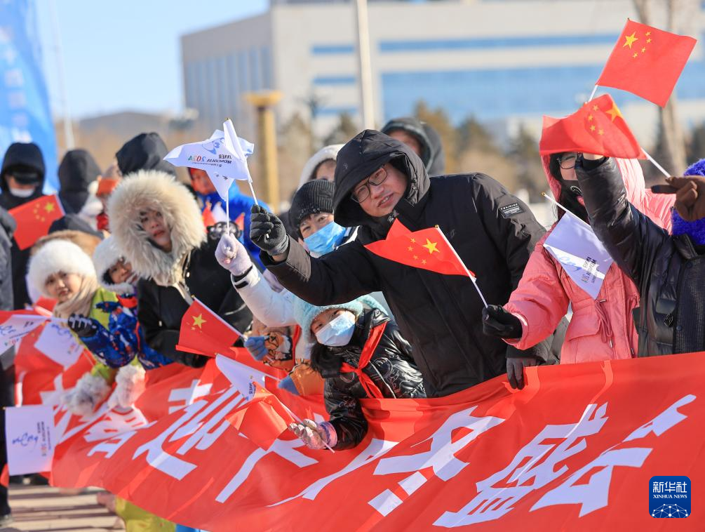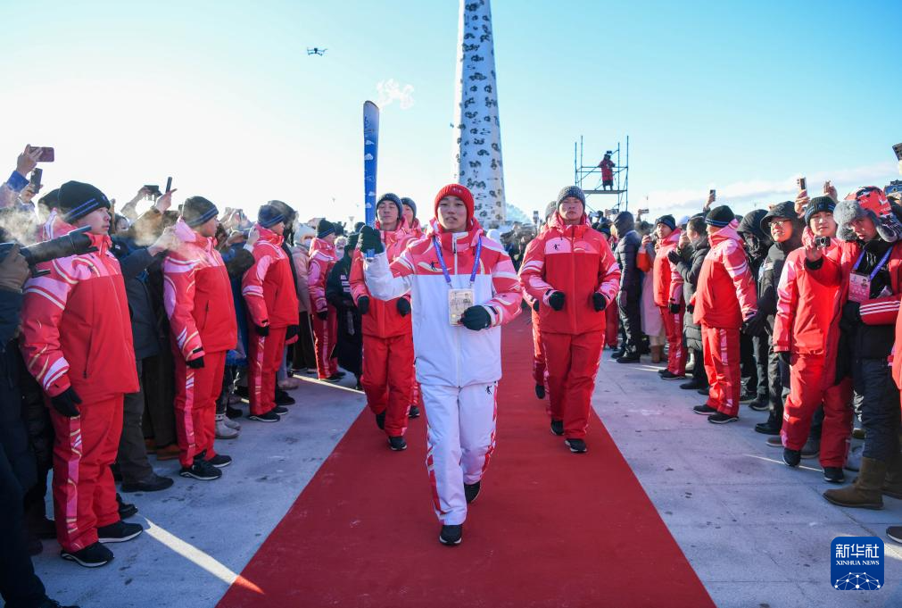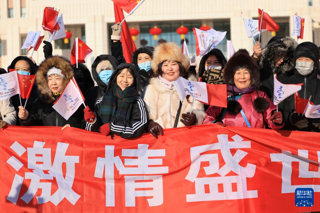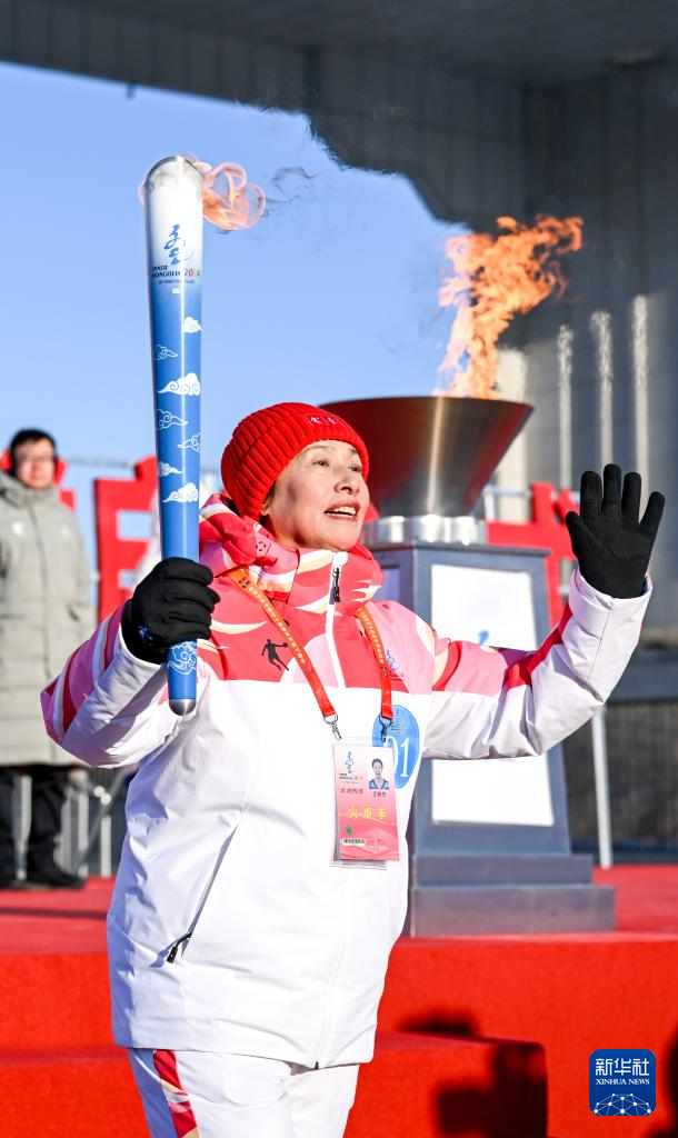 2月3日,在内蒙古呼伦贝尔市满洲里国门景区,第一棒火炬手王桂芳在火炬传递活动中。