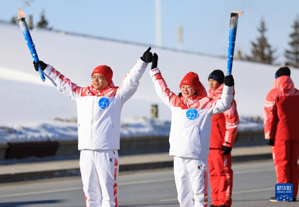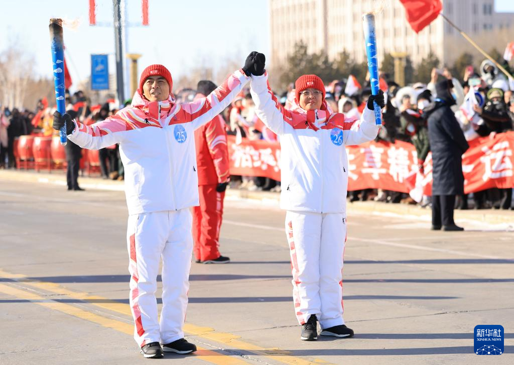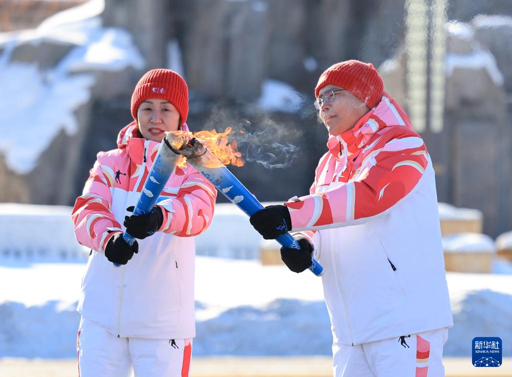 2月3日,火炬手景晓涛(右)、乌兰托娅在火炬传递活动中。