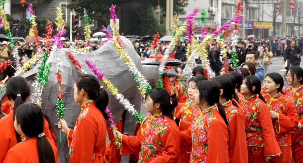 “打春牛啰!愿五谷丰登,六畜兴旺!”一群身着大红春装的少女,围着一头纸制的春牛鞭打。立春日前夕,四川德阳绵竹举行年画节,延续着一年一度游春、打春习俗。