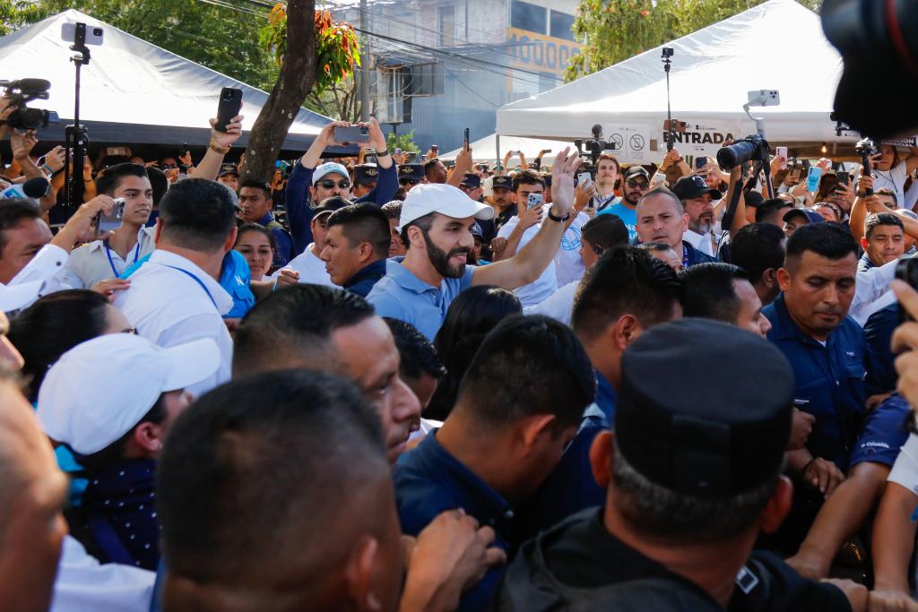 2月4日,在萨尔瓦多圣萨尔瓦多省,新思想党代表的竞选联盟候选人纳伊布·布克尔(中)向其支持者致意。新华社发(亚历山大·培尼亚摄)
